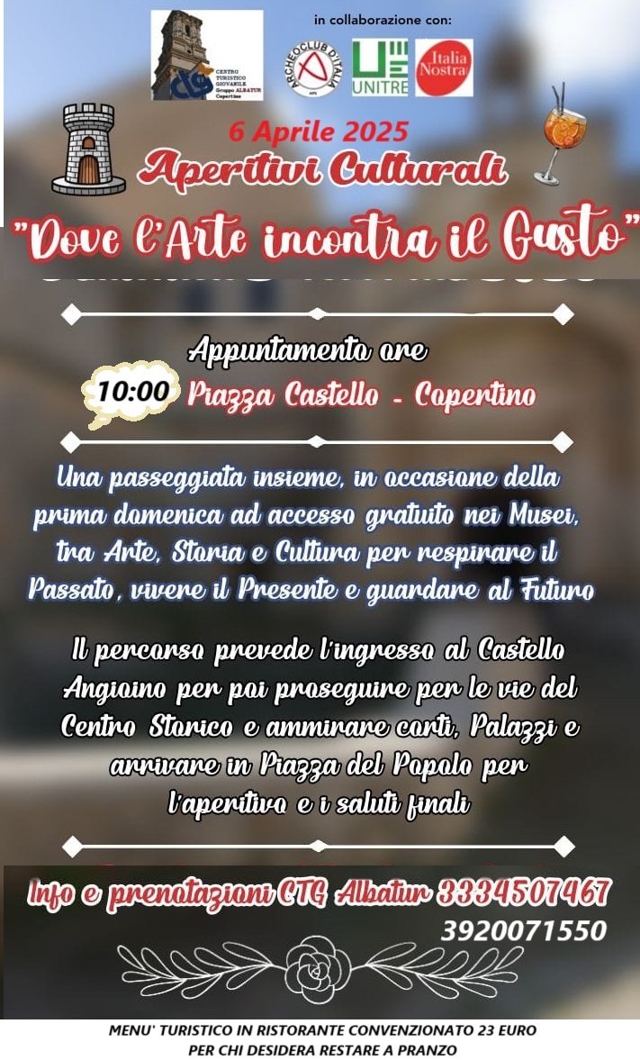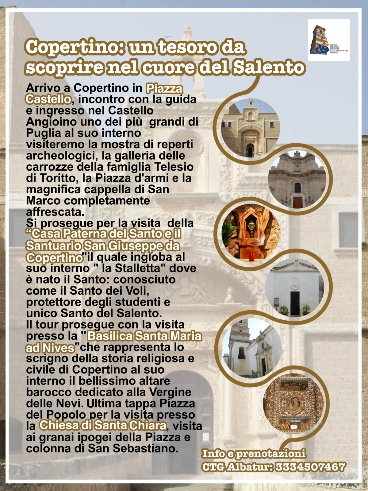 L'Albatur CTG Copertino (Centro Turistico Giovanile) è una realtà fondamentale per la promozione del territorio e del turismo sociale a Copertino. Da anni opera come ponte tra la comunità locale e i visitatori, con un focus particolare sulla valorizzazione della cultura, della spiritualità e delle tradizioni salentine.